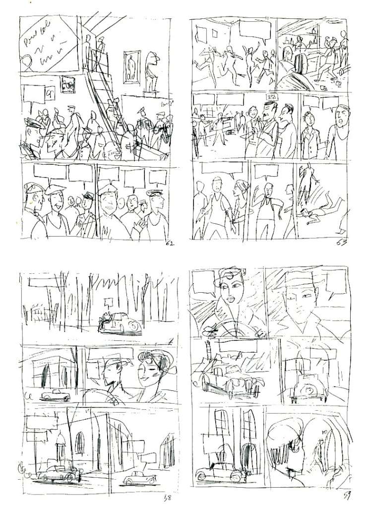 Pour Simenon, l’Ostrogoth, il va sortir de sa zone de confort en quittant les rivages de l’illustration reprenant la phrase qui l’a inspiré au bas de l’image pour aborder ceux plus tumultueux de la bande dessinée avec ses cases, ses strips, ses bulles. Pour ce faire, Il a réalisé un storyboard très précis dont on peut retrouver des extraits sur la couverture des trois cahiers.