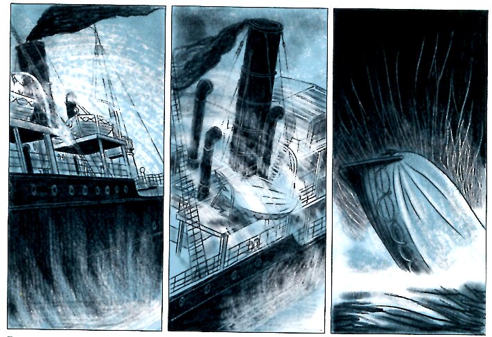 Dessinateur caméléon qui adapte son style au récit, porté par le réalisme poétique à la Prévert de Remorques il utilise ici un trait charbonneux semi-réaliste, faisant du bateau un personnage à part entière mis en valeur par ses cadrages et éclairages.