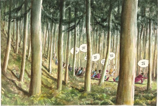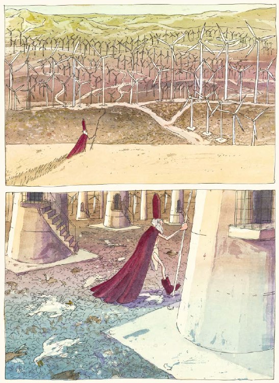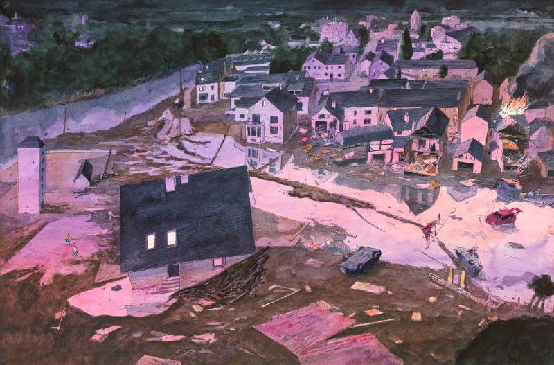 La narration se fait donc essentiellement par l’image. Avec sa jaquette à la Chris Ware, son grand format, l’album entièrement réalisé à l’aquarelle et au Staedler le plus fin du marché est un très bel objet. Chaque case, pleine page ou double page fourmille de détails et est une porte grande ouverte sur l’imagination et fait jaillir tour à tour émotion ou violence.