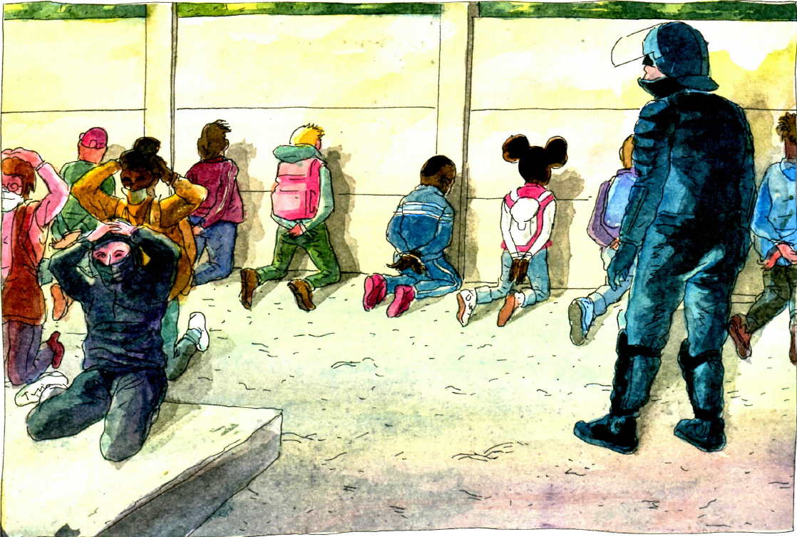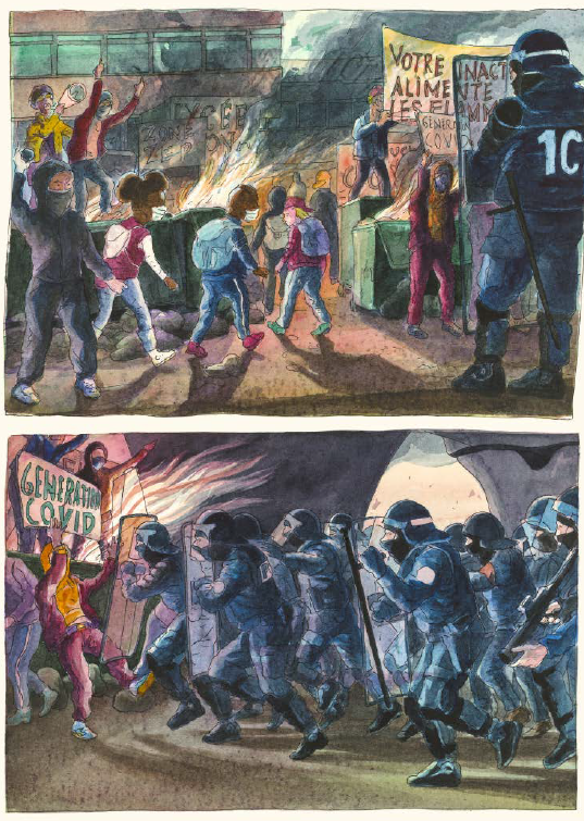 « Chaque image est une sorte de petit tableau. J’ai aimé créer avec l’aquarelle des contrastes, avec des ambiances qui sont presque sucrées par moments. Les couleurs sont séduisantes, assez acidulées, et de ça peut sourdre une grande violence. Quand on feuillette le livre, on a n’a pas l’impression d’être dans un univers ‘dark’, sombre. Et quand on s’y plonge, on se rend compte que cette couleur elle est plus irradiée, elle est presque nucléaire, alors que ce que je montre ce sont des images qui viennent directement du réel, ce sont des icônes télévisuelles« .
