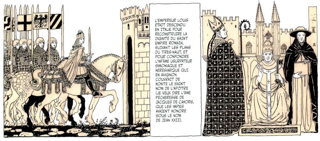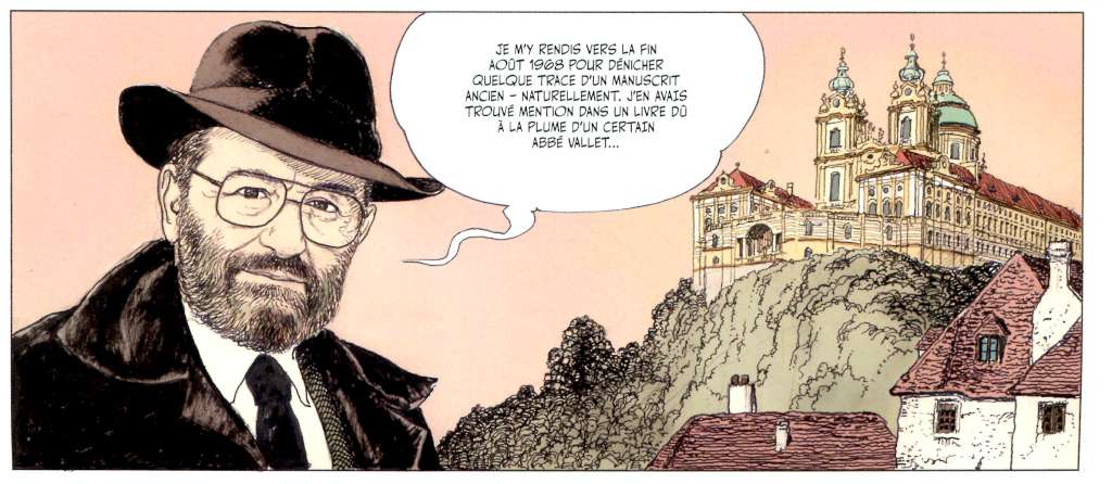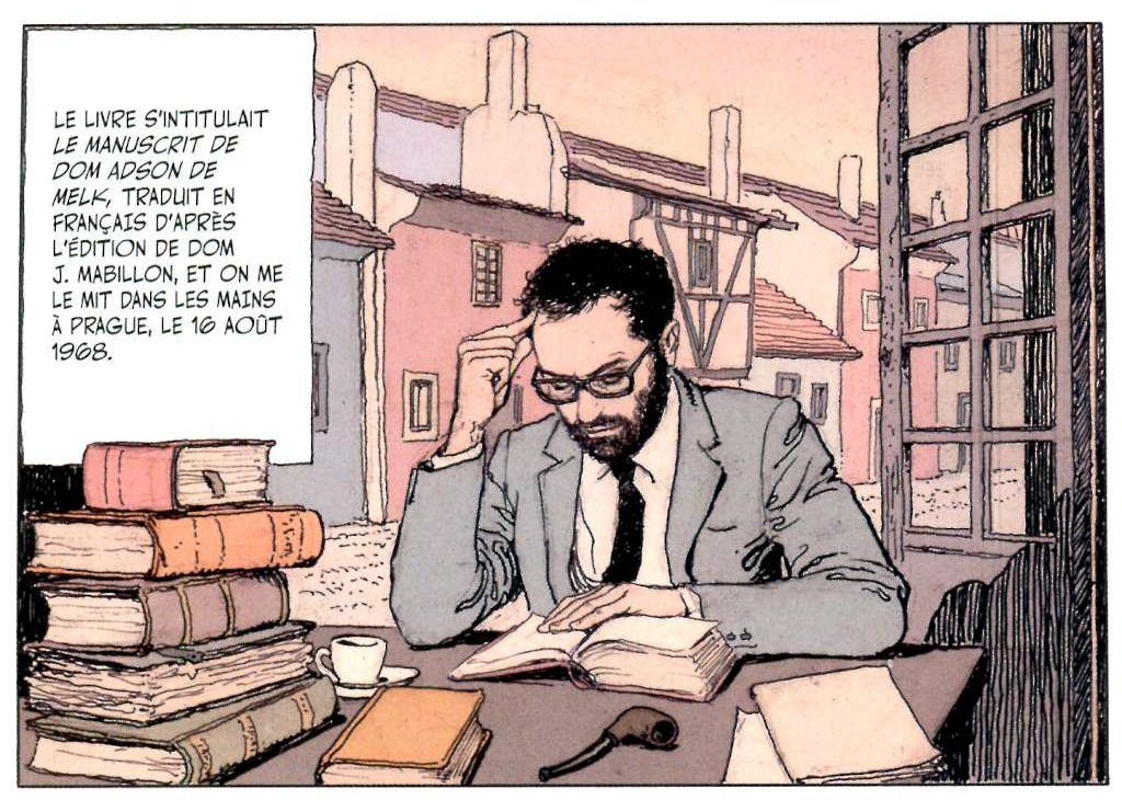 Le livre d’Umberto Eco s’ouvre sur un court récit de 6 pages intitulé « Un manuscrit, naturellement » dans lequel il fait part de la façon dont il aurait découvert l’existence du manuscrit d’Adso et des recherches alors effectuées que Manara traduira graphiquement par l’Umberto Eco chercheur de la fin des années 60 et l’Umberto Eco écrivain de 1980 s’adressant au lecteur avant de glisser subtilement – Au commencement était le verbe – au prologue du roman en donnant la parole cette fois au vieil Adso qui comme dans le roman va contextualiser le récit qui va suivre par les apports historiques, politiques et religieux nécessaires à la compréhension du roman.