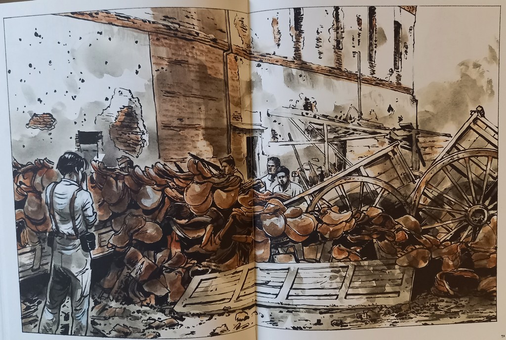 Oui, j’ai voulu parfois donner à voir ce qu’eux voient. Notre choix permanent, c’était vu par eux donc la guerre d’Espagne telle qu’ils la voient, etc… et donc parfois je me suis amusé, entre guillemets, à montrer la scène que je voulais montrer mais à travers l’objectif du Rolleiflex qui quadrille pour dire c’est ce qu’ils voient, c’est ce qu’ils choisissent de regarder aussi. Je me suis amusé aussi parfois quand on a une photo ou deux photos d’eux, d’imaginer la photo entre les deux qu’ils auraient pu prendre, qu’ils ont peut-être prise on ne sait pas ou le mouvement entre les deux enfin, voilà. Aussi parfois, en représentant l’une de leur photos je les ai rajoutés, enfin j’ai rajouté l’un des deux en train de faire la photo. Il y a une double page là où il y a une barricade faite avec des selles de cheval qui est une de leurs photos.