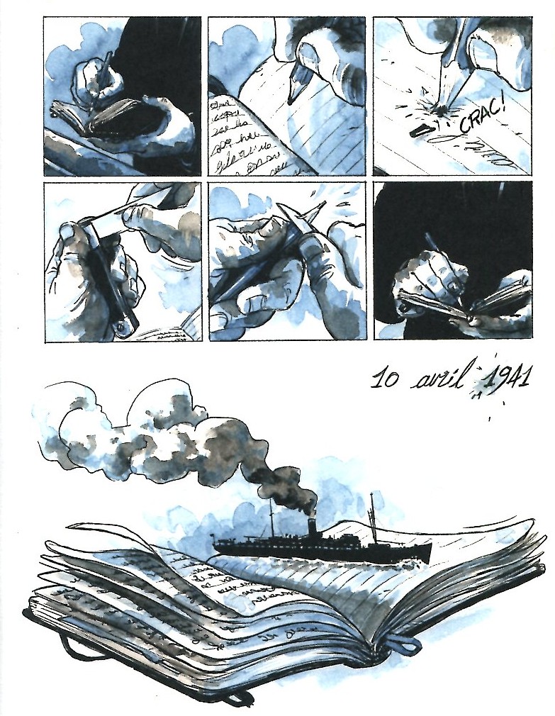 L’idée c’était aussi Emmanuel Guibert l’a très bien fait dans Le photographe mais nous l’idée c’était de conserver une espèce d’unité dessin, texte voilà, ne pas ramener une troisième façon.