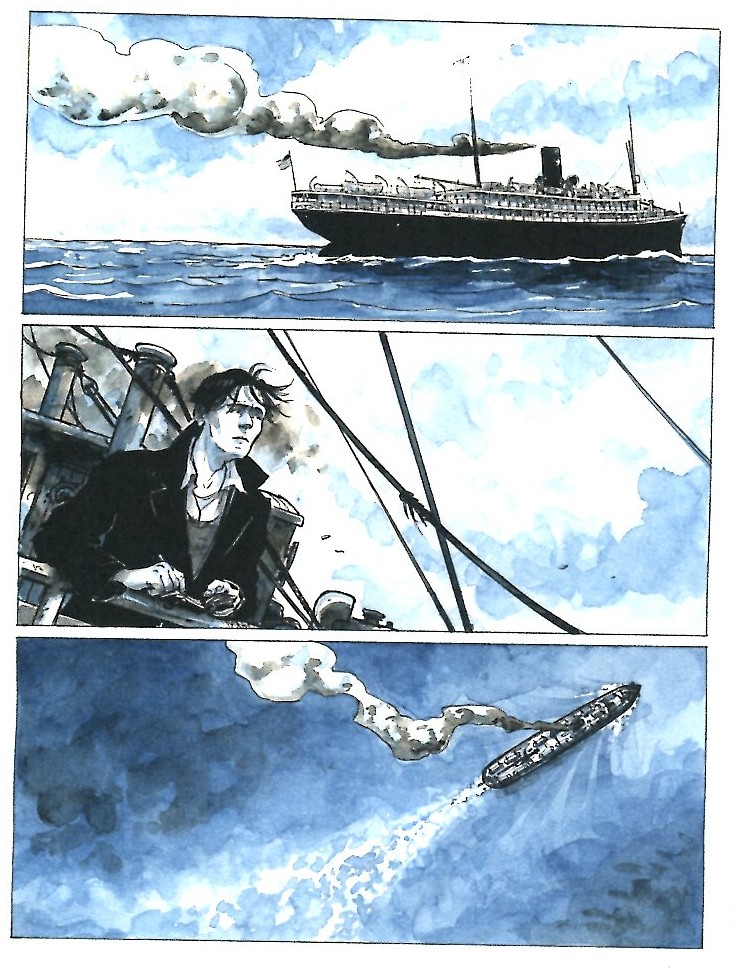 Alors c’est une espèce de mix. J’ai choisi de faire le trait en numérique. Donc je travaille sur une tablette avec le logiciel Procreate qui permet d’avoir quand même des outils qui ressemblent pas mal à des outils manuels parce que ça m’aidait en terme de rapidité et puis dans la construction. Ça permettait de démarrer des dessins sans savoir encore forcément quelle taille ils allaient avoir dans la page. Moi, je sais que j’aime bien réaliser des éléments et puis les assembler un peu après. Les pages qui sont de la bd classique avec des cases, c’est moins le cas mais sur les pages composées, il y a un truc que j’aime beaucoup faire, c’est de dessiner les éléments séparément et venir les mettre parce qu’en fait, rien que quand on les insère dans le fichier, parfois ils se placent d’eux-mêmes par hasard d’une manière qu’on n’aurait pas pu du tout imaginée et c’est des accidents que j’aime beaucoup. Moi, je suis un grand partisan des accidents dans le processus créatif. Je préfère toujours les choses qui ne sont pas ce qu’on avait imaginé, qui sont là où elles se sont retrouvées en décidant d’y aller et cette façon numérique de travailler permet ça même s’il y a moins d’accidents de tracé mais néanmoins le numérique permet une certaine légèreté, une certaine insouciance de la main puisqu’on sait qu’on pourra tout corriger donc on n’est pas figé ou terrorisé par le beau papier, la plume … Par contre, moi j’ai besoin de travail à la main aussi même si avec la tablette on travaille avec la main, mais je veux dire de travailler sur le papier et puis sur la mise en couleur que je fais à l’aquarelle, au lavis. Je n’aime pas quand c’est fait numériquement. Ce serait très très long d’obtenir numériquement ce que j’obtiens en allant assez vite. Et puis c’est pareil, que ce soit avec l’aquarelle ou l’encre, il y a aussi des accidents qui se produisent. Oui. En fait, c’est l’aquarelle qui fait le travail, ce n’est pas moi. Les taches, elles vivent leur vie. Moi c’est ce que j’aime dans l’aquarelle. C’est qu’on tente un truc et puis il se passe autre chose qui est plus intéressant que tout ce qu’on aurait pu imaginer. Donc je fais le trait à la tablette, j’imprime sur un beau papier et ensuite je fais le lavis à la main Ce qui intéressant comme procédé parce que justement si au niveau de aquarelle ça ne vous plaît pas … Eh bien je peux toujours réimprimer. C’est rigolo parce qu’en fait je me dis ça et sur celui-là, je n’en ai réimprimé aucune. Après ce n’est pas que je sois spécialement doué en aquarelle mais je pense que le fait d’avoir cette sécurité fait que je n’en ai pas besoin. Alors que ça m’est arrivé de faire quelques pages où je fais tout à la main et il y a une espèce de stress qui est plus paralysant qu’autre chose. Là, je sais que je peux réimprimer au cas où, ça libère.