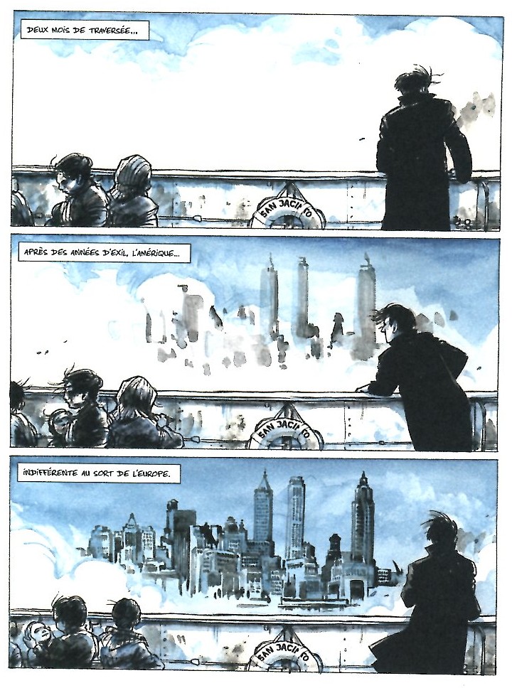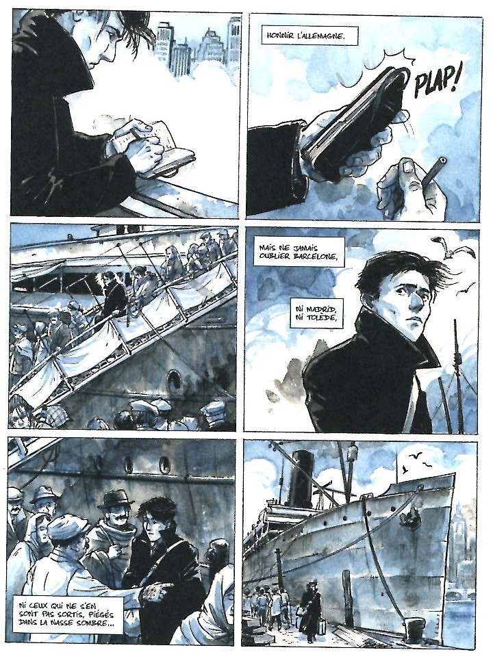 Mais ce récit permettait aussi d’envisager certaines pages comme une entité et moi je sais que ce que j’ai beaucoup aimé c’est de mener une page du début à la fin sans m’arrêter : prendre le texte, aller jusqu’à la couleur, les bulles, scanner, mettre les bulles etc… et passer sur la page suivante où il n’y a encore rien. Et tout est possible sur la page suivante et l’idée, elle vient peut-être dans la nuit entre les deux. L’idée, elle vient peut-être en ayant fait la couleur où je me dis Ah je pourrais faire ça. Oui donc forcément vous avez suivi l’ordre chronologique. Oui, j’ai fait dans l’ordre à part le prologue qui n’a pas été fait tout de suite. Ce n’était pas facile parce que quand on ne fait pas de storyboard, ça peut être un peu « casse gueule ». Il faut avoir une idée quand même de la structure globale, du rythme etc. Et quand j’ai commencé à faire les pages, en fait Raynal n’avait pas fini de faire ses recherches donc la fin de l’histoire, on n’était certain de ce qu’elle serait. On savait qu’on ne raconterait que la réalité, qu’on raconterait ce que Raynal trouverait et donc plus il trouvait des choses, plus ça rallongeait et plus ça modifiait la fin. Quand j’ai commencé toute la première partie qui est sur Barcelone – ça il avait des informations, j’avais de quoi démarrer – mais au moment où je dessinais ça, je ne savais pas du tout si cette partie-là représentait la moitié ou un quart du livre, donc c’est ça qui était un peu difficile mais après, assez vite, au bout de six mois, il avait quand même trouvé. C’était super en plus de travailler sur des pages de Barcelone et d’avoir Raynal qui appelle en disant J’ai retrouvé la petite-nièce. Elle m’envoie des documents. En fait, ils ont fait ci, ils ont fait ça … donc c’était super.