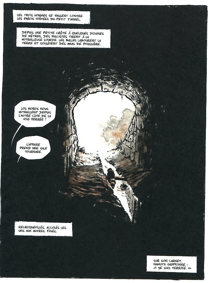 En fait, c’est un noir assez chaud et un terre de Sienne brûlée qui est la couleur que je mets partout tout le temps – il faut que j’arrête (rire) – mais qui est une couleur que j’adore et qui a l’avantage de fonctionner très très bien pour la peau, les visages et l’environnement et aussi pour dire la chaleur, la sécheresse, le feu…. On était en Espagne, la guerre … ça donne un côté sépia qui parle aussi du fait que c’est une époque passée. Enfin ça cochait pas mal de cases. Après dans l’album, l’idée c’était que ça noircisse un peu au fur à mesure que leur horizon se noircit aussi.