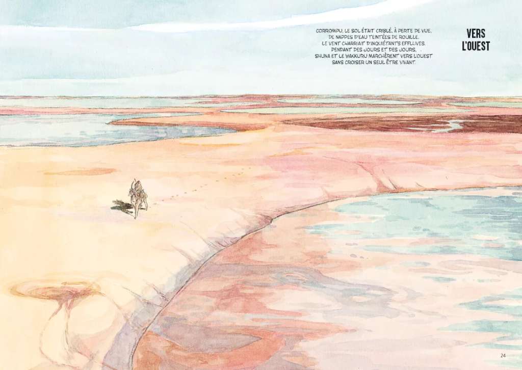 Outre la qualité du papier à l’aspect de papier aquarelle et de l’impression, l’ouvrage est doté d’une belle couverture carton et enrichi de la note de contextualisation d’origine de Miyazaki ainsi que d’une postface signée Alex Dudok de Wit, celui par qui tout a commencé. En contact avec les studios Ghibli à l’occasion de l’écriture de son étude sur Le tombeau des lucioles (autre chef d’œuvre d’animation des studios Ghibli signé Isao Takahata) parue en 2023 chez Akileos, il a négocié la traduction étasunienne du Voyage de Shuna. Shuna’s Journey traduit par ses soins est paru en 2022 aux éditions First Second Books. Suivront bien que négociées après la version française, les versions allemande en septembre, italienne et espagnole en octobre 2023.
