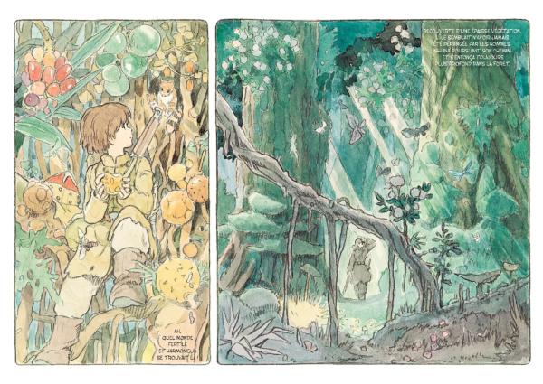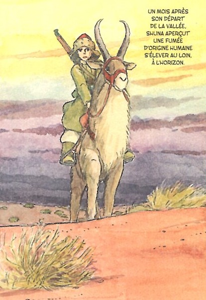 La gestation de Nausicaä de la vallée du vent s’est déroulée en même temps que celle du Voyage de Shuna et les deux ont de nombreux points communs. Le manga a commencé à être publié début 1982. Le succès rencontré donnera naissance au film d’animation en 1984. On y retrouve l’intemporalité du récit, les paysages post-apocalyptiques contaminés par la pollution, la forêt luxuriante, la raréfaction des ressources naturelles … Et le chara-design des deux héroïnes est très proche. Seule leur tenue vestimentaire les distingue.