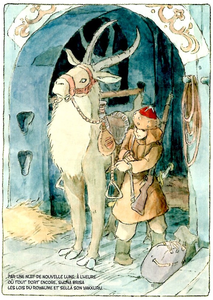 Quant à Princesse Mononoké, il suffit de voir Shuna sur son yakkuru pour qu’immédiatement surgisse l’image emblématique d’Ashitaka sur Yakkuru. Shuna et Ashitaka : deux princes d’un petit royaume, héros solitaires qui au cours de leur quête vont rencontrer l’un Théa, l’autre San.