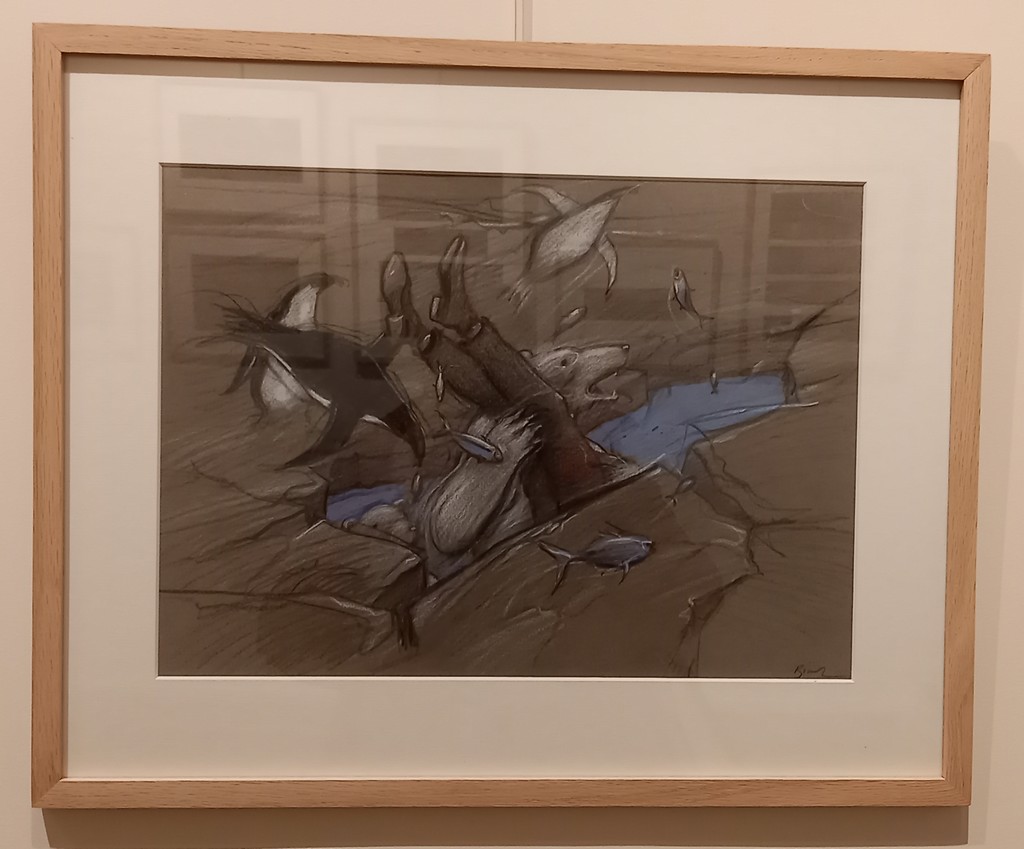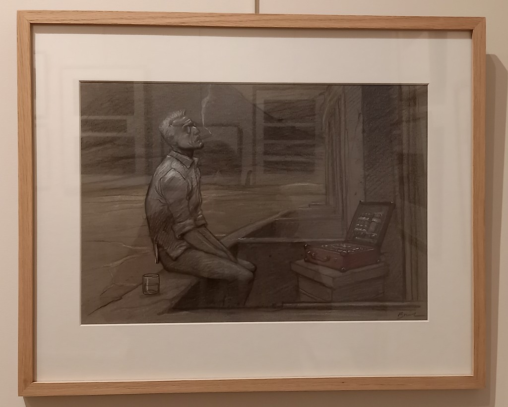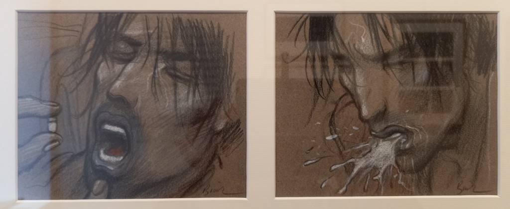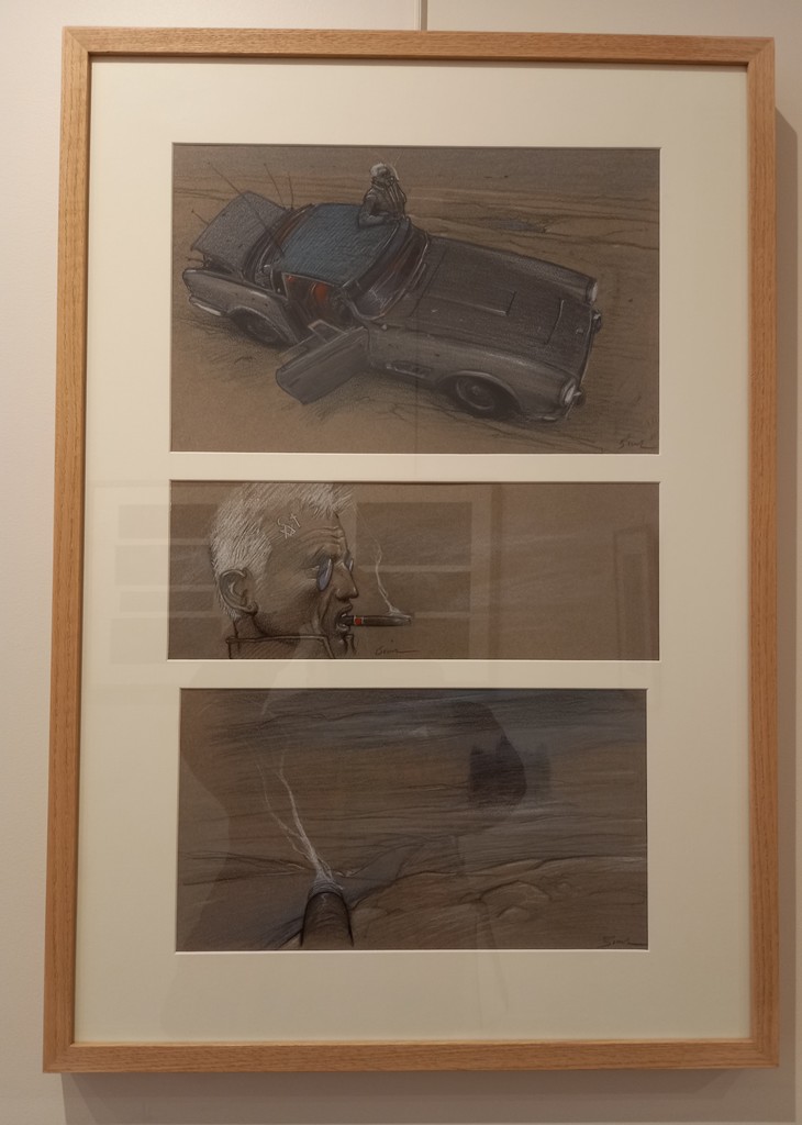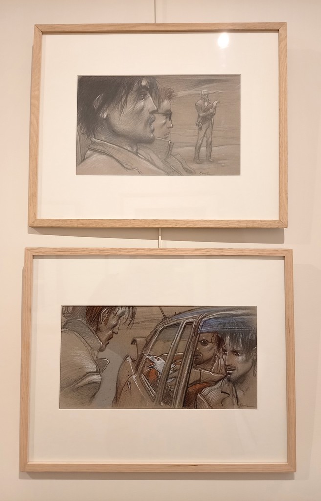 Il lui a fallu faire un choix parmi les cases de l’album. Une soixantaine de dessins préparatoires à la mine de plomb sur calque vont être mis en relation avec leur exécution au pastel et crayon gras sur papier teinté : sur la page de droite, là où se pose l’œil en premier, l’esquisse et à gauche la case originale sur papier teinté.