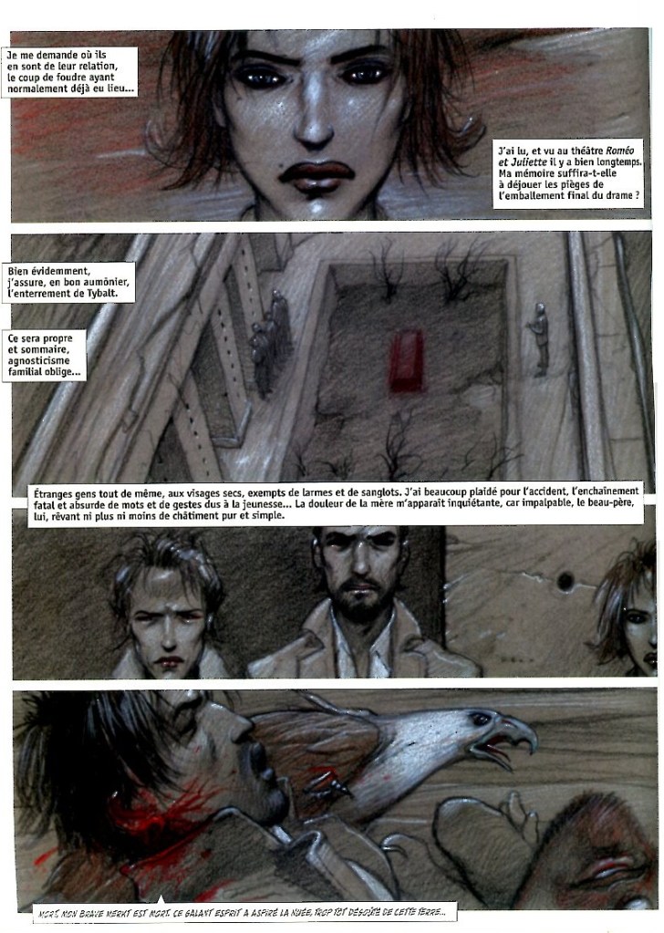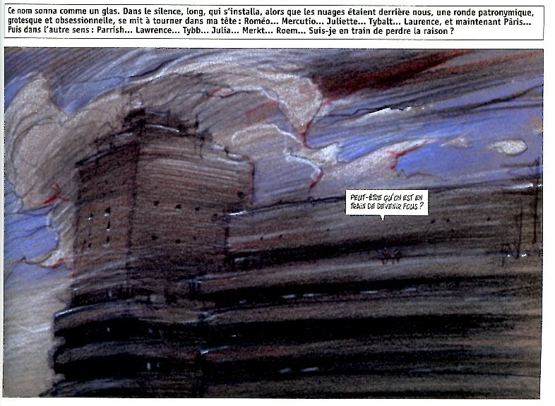 Nous ne sommes plus à Vérone mais dans une contrée désertique, un monde monochrome traduit par le trait au pastel et crayon gras noir, bleu, rouge et blanc sur un papier teinté ocre, couleur de la terre mettant parfaitement en valeur les rehauts de blanc. Accompagnant les planches, des citations de Juliette et Roméo de Shakespeare.