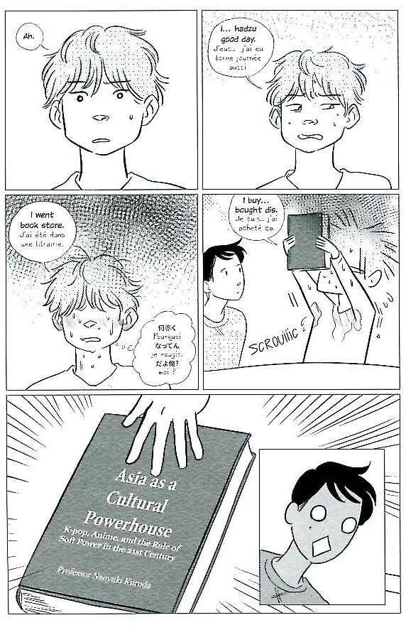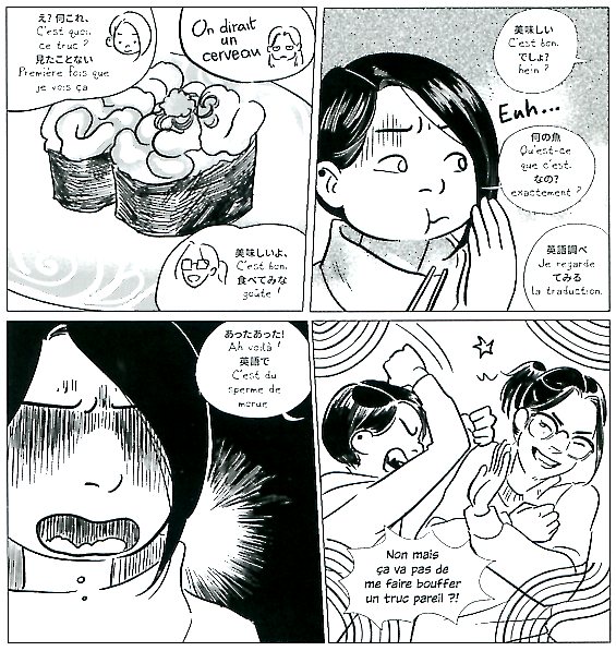 Dans ce roman graphique on a ainsi toutes les variations possibles des difficultés à s’intégrer dans un nouveau pays et à assimiler une nouvelle culture grâce aux aventures des trois héroïnes et de leurs apprentissages plus ou moins heureux de la langue. L’empathie du lecteur est d’ailleurs provoquée graphiquement par la retranscription des idéogrammes tels quels dans les phylactères, avec parfois la traduction quand le personnage comprend et parfois de gros blancs qui miment les difficultés de communication entre la protagoniste et son entourage.