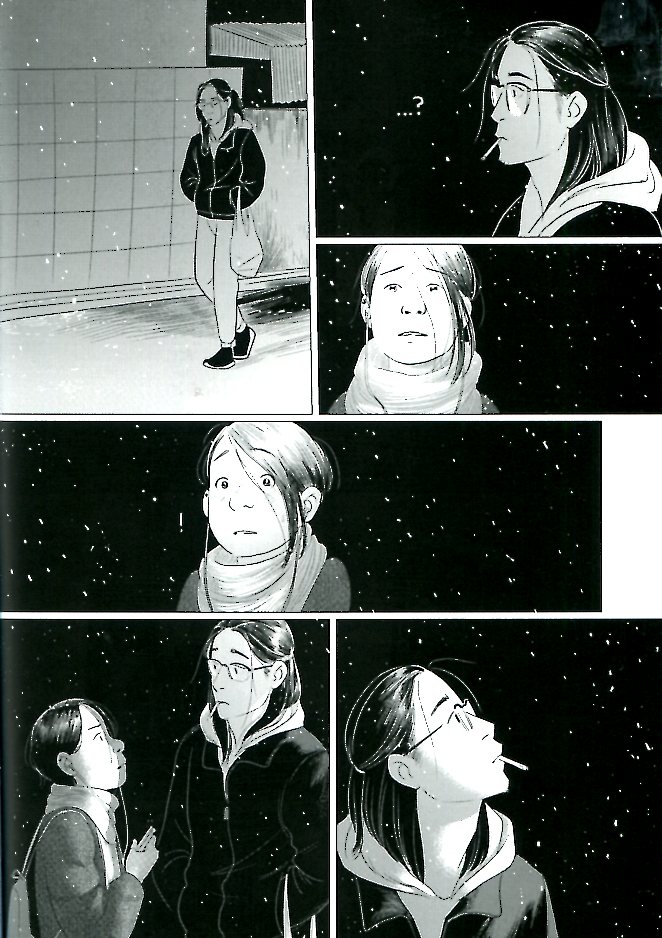 L’album est découpé en 21 chapitres – comme les 21 ans marquant l’accès à la majorité aux USA et à Singapour – …. L’histoire se déroule sur une année (le temps du séjour de Nao) et est rythmée par le passage des saisons. L’autrice prend son temps pour installer l’atmosphère et camper ses personnages mais on échappe à la simple linéarité narrative grâce à de nombreux flashbacks. On découvre en effet peu à peu, grâce à eux, les raisons qui ont amené Nao, Tina et Hyejung à venir au Japon. Ils sont souvent dispensés au lecteur de façon déroutante par associations d’idées ou d’odeurs et ils permettent d’aller au-delà de la surface et de caractériser les personnages avec davantage de profondeur que ce que l’on aurait pu attendre d’un livre étiqueté « young adults » tout en instaurant un véritable dynamisme. Harmony Becker s’interroge en plus du déracinement dans ce récit choral où le trio féminin est au premier plan sur la condition féminine en Asie, le rapport aux parents et à l’obéissance. Elle réalise un joli portrait de femmes en quête d’émancipation et nous livre une réflexion sur la société qui cherche à tout prix à mettre les gens dans des cases …