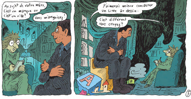 « Un vide, ça se remplit », lui confie son psy. Le seul fait de fabriquer des images permet de remplir ce vide et de créer de nouveaux souvenirs : Joann avoue qu’il accorde ainsi beaucoup d’importance aux images. Cet échange vient aussi en écho d’une conversation, lorsqu’il était plus jeune, avec un rabbin. Peut-on figer le souvenir d’un défunt, de sa propre mère, par une image ? Lorsqu’on s’en remet à une image plutôt qu’au monde, cela ne devient-il pas de l’idolâtrie ? Une image interdit-elle toute forme de dialogue ou de confrontation au monde ? Ou, au contraire, dessiner et surtout raconter (le propre de la bande dessinée) n’est-il pas une forme de liberté, d’ouverture et de compréhension du monde qui nous entoure ? Finalement, n’est-ce pas là une forme de thérapie ?…