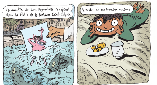 Côté représentation, il joue avec les échelles, la perspective et la temporalité de son trait jeté extrêmement dynamique. Le formidable travail de Brigitte Findakly, sa coloriste depuis Le Chat du Rabbin crée les ambiances et apporte une grande lisibilité à son dessin foisonnant.
