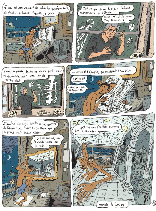 Outre le côté intime, Sfar aborde le côté professionnel : Ses années de formation aux Beaux-Arts, l’importance de son professeur Jean-François Debord qui jugeant les cours d’autopsie inutiles les avait supprimés, les rencontres déterminantes avec Moebius et Sempé mais également Jacques Rouxel, le créateur des Shadoks sans oublier l’elficologue Pierre Dubois ou le philosophe Clément Rosset dont il a été l’élève.