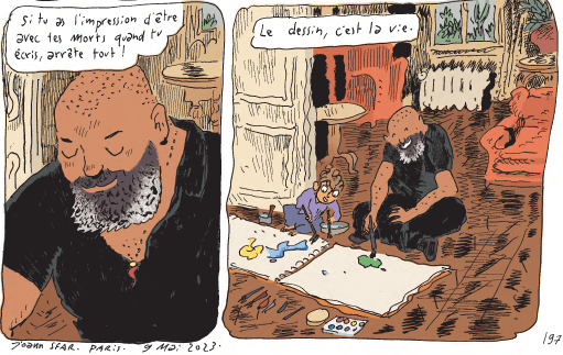 Sa religion ? le dessin. L’écriture ou la vie, le mantra de Jorge Semprún. Le dessin, c’est la vie, celui de Joann Sfar.
