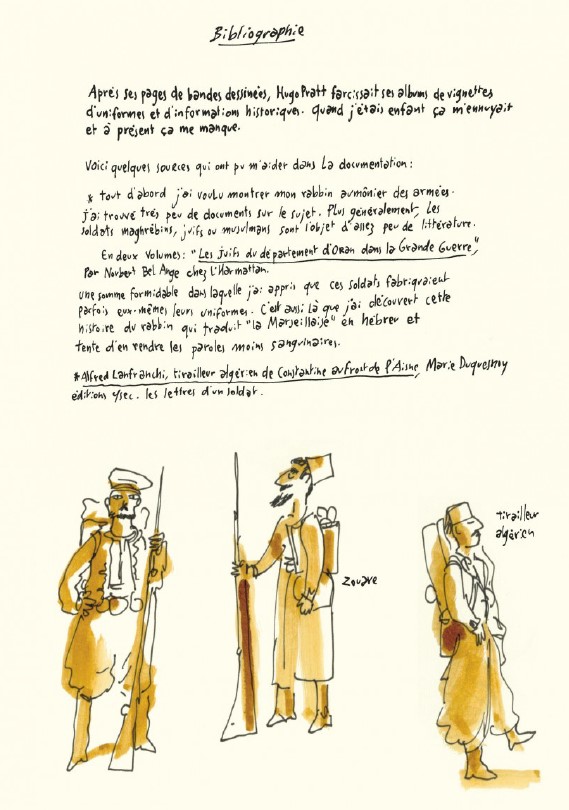 L’album s’achève sur 5 pages de bibliographie commentée et illustrée. C’est alors l’occasion pour lui de rendre hommage au maestro qu’il admire et ne cesse de citer : Hugo Pratt. De lui, il tient son affinité pour le plume et l’encre de Chine.