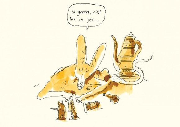 Cela fait très longtemps que Joann Sfar voulait faire un récit de guerre avec le Chat du Rabbin et plus de dix ans qu’il avait en tête l’histoire des mutins de la mer Noire. Avec La traversée de la mer Noire, il fait d’une pierre deux coups.
