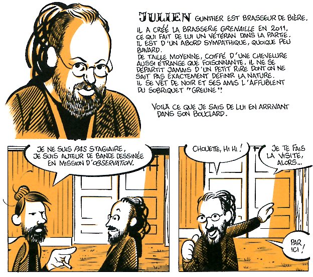 Pour son récit, rompu aux reportages en bd, le dessinateur va éviter l’écueil du reportage trop didactique en se mettant en scène. Il brassera plusieurs ingrédients : le trajet d’une bouteille de bière Grenaille de la création de sa recette à sa commercialisation, le portrait de Julien Gunther le brasseur et ses relations personnelles avec la bière, le tout saupoudré d’une bonne dose d’humour .