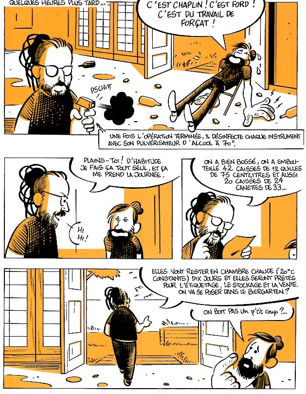 Loin de se limiter au rôle de simple observateur, il va être acteur à part entière lors des différentes étapes. Et tout ça, il va le mettre en scène graphiquement en usant d’un découpage et d’une mise en page variés, en forçant le trait, en faisant presque passer le brasseur pour un bourreau esclavagiste tout en se représentant lui-même en fumiste qui ne pense qu’à boire des bières. Ce procédé rend le récit extrêmement vivant.