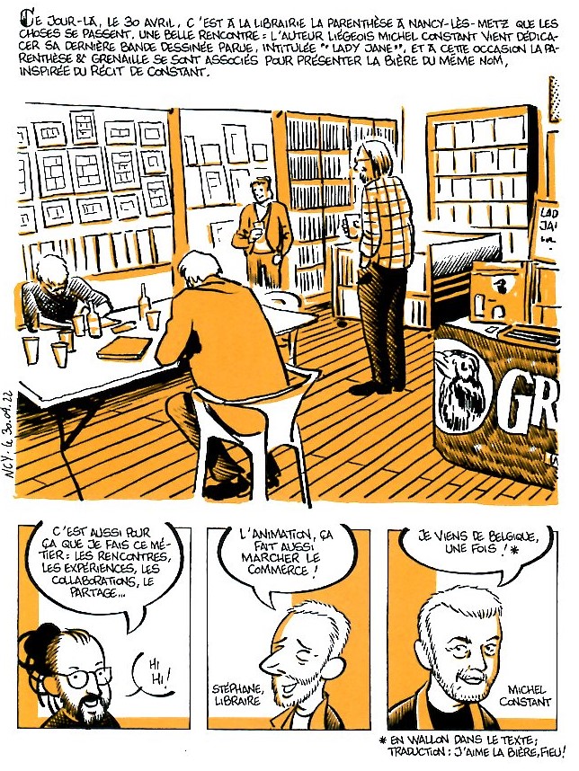 « La commande est arrivée depuis les Hauts-Quartiers de la librairie La Parenthèse de Nancy-lès-Metz en France. [NDLR : Les Nancéiens apprécieront…]. L’agitateur Stéphane Godefroid voulait faire se rencontrer le récit et les façons de faire d’un brasseur anarchiste, et la mise en bande dessinée de ce récit par un auteur de bande dessinée. »