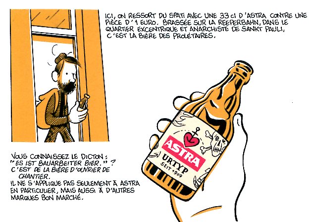 Pour ce grand amateur de bière, l’aventure aurait pu se terminer outre-quiévrain mais c’est outre-rhin à Hambourg plus précisément que nous mène Nicolas Moog parti pour une nouvelle résidence à l’institut français, l’occasion pour nous de découvrir l’ASTRA, bière populaire bon marché. On a quitté le domaine de la bière artisanale pour celui de la bière industrielle. Bière de prolo, contre bière de bobo : Tout comme le bio, consommer de la bière artisanale n’est pas à la portée de toutes les bourses.
