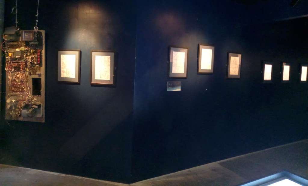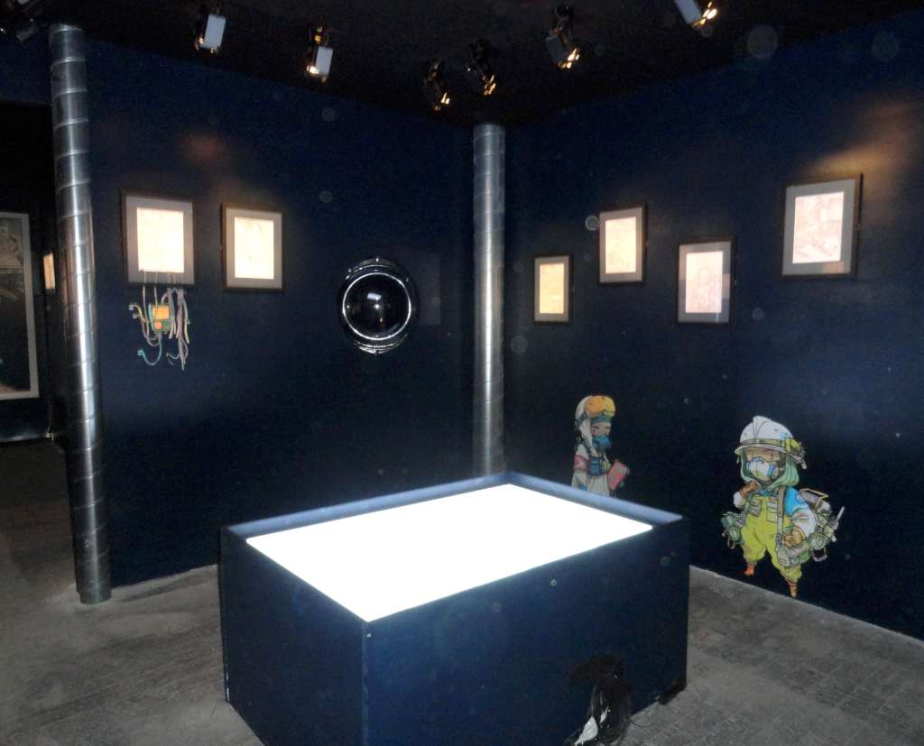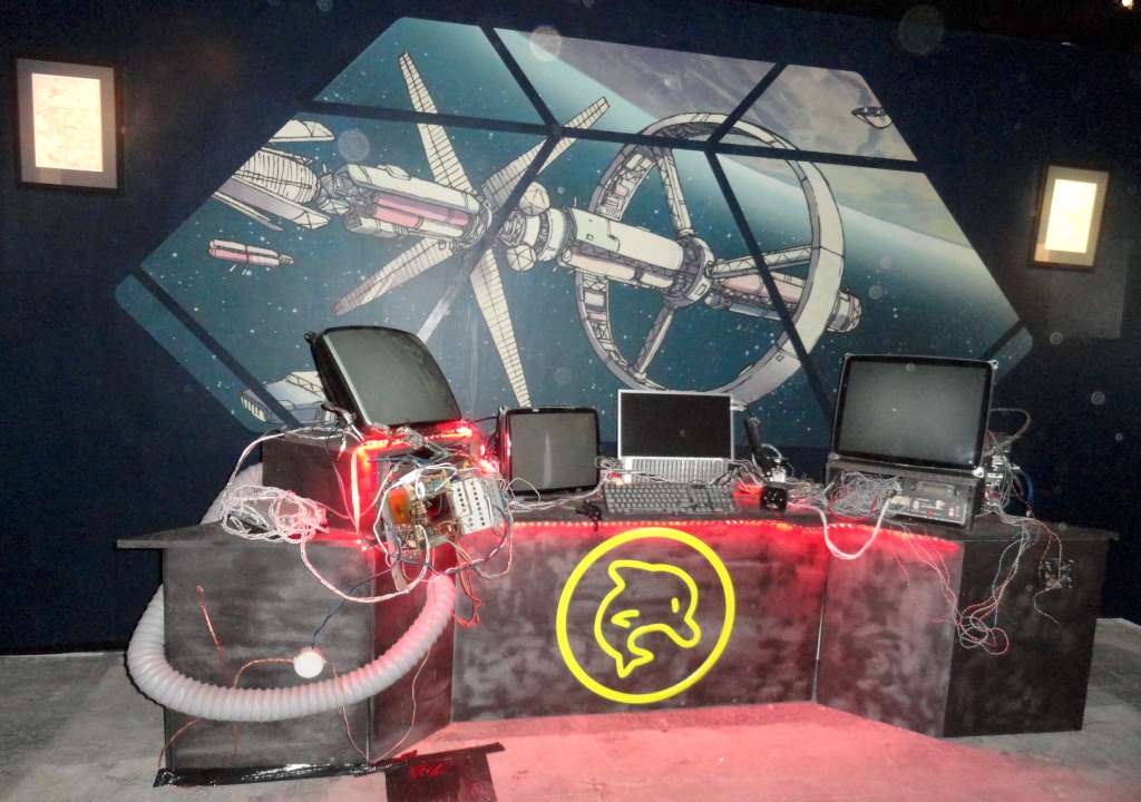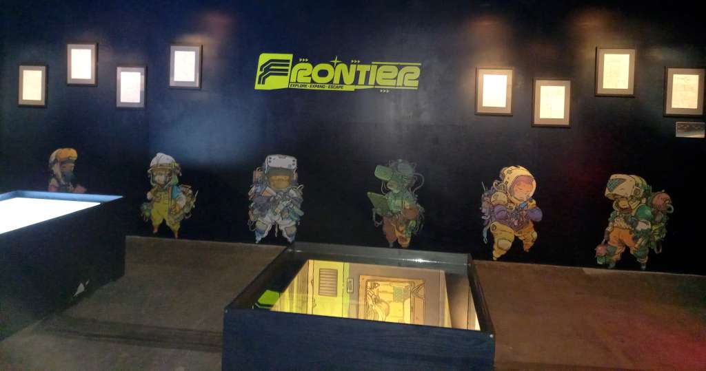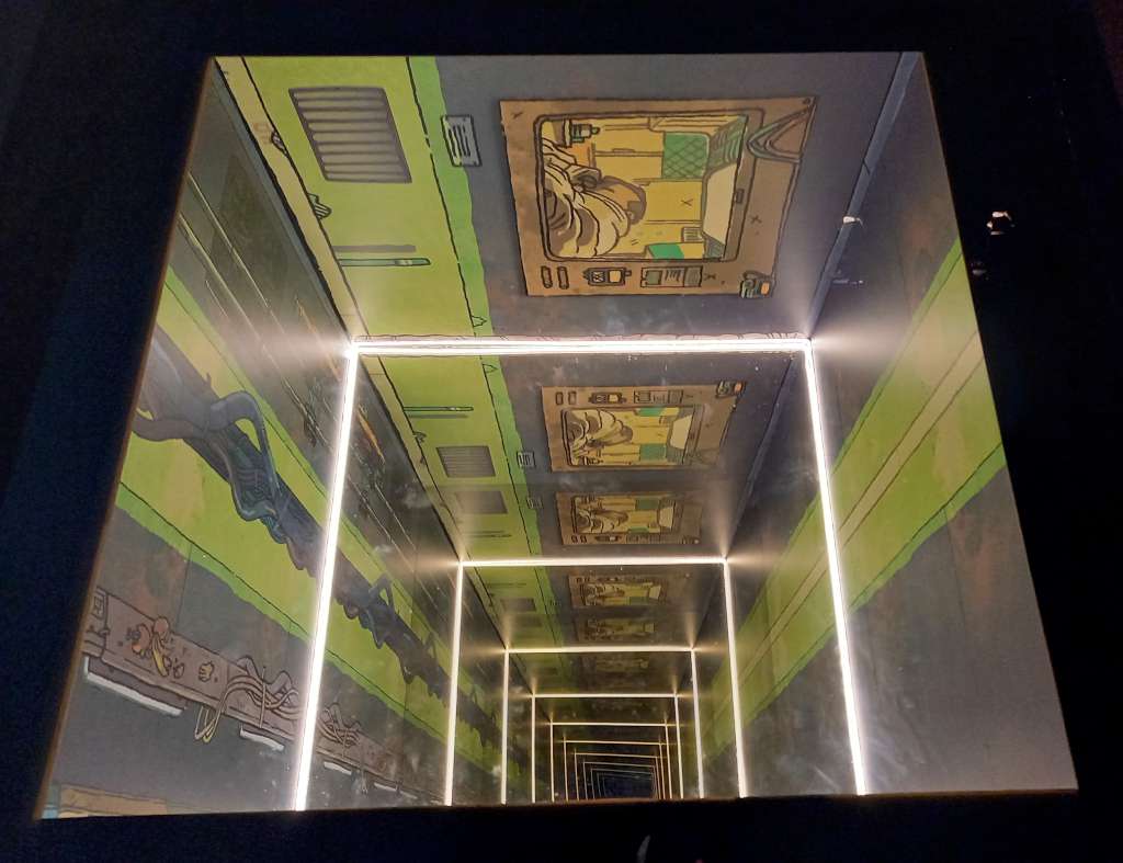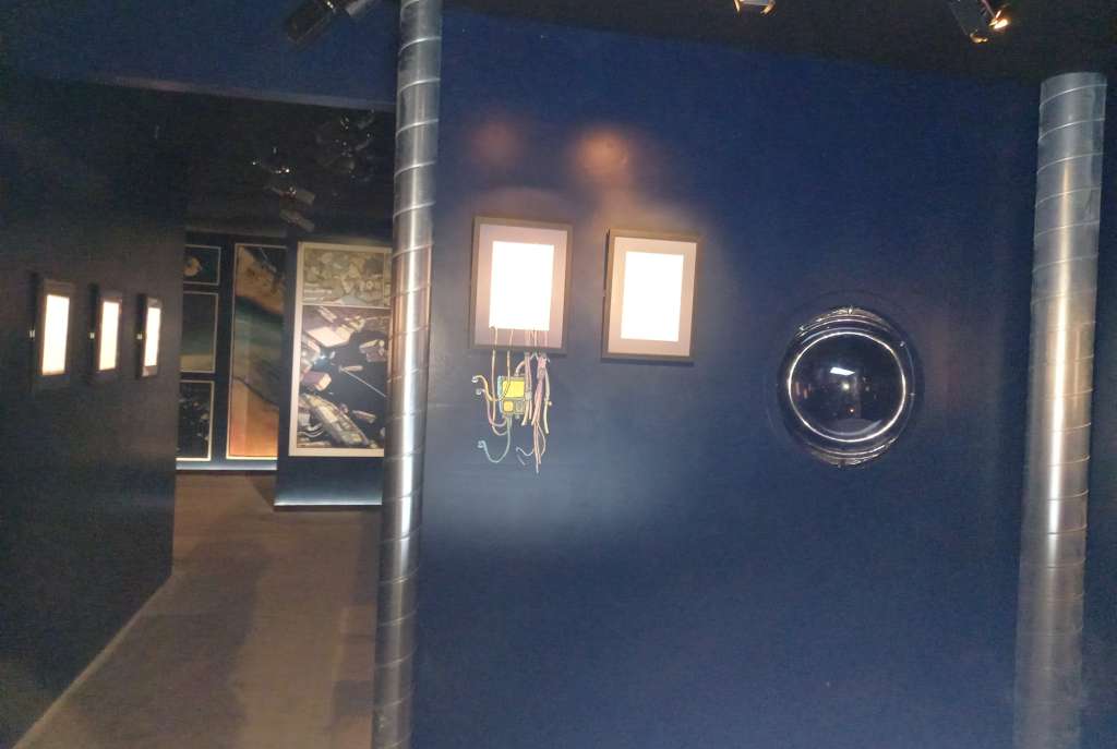 Passé le rideau noir, nous voilà embarqués dans l’univers interstellaire de Frontier. Plongés dans l’obscurité, que viennent juste troubler des jeux de lumière tel ce puits qui semble vouloir nous happer, nous ne pouvons qu’admirer les planches judicieusement éclairées et mises en valeur par la scénographie immersive.