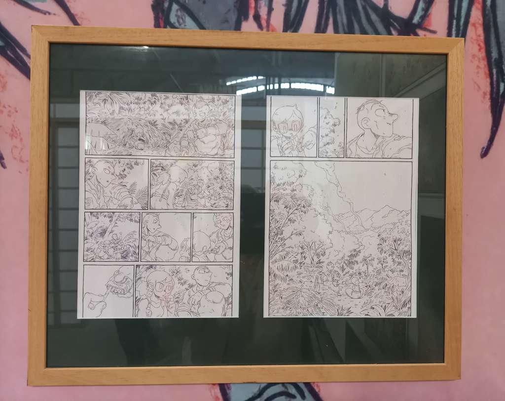Cet amoureux du dessin ainsi qu’il se définit dessine en tradi toujours sur format A4 afin d’être au plus près du rendu pour le lecteur et utilise les outils les plus simples qui soient. Aussi encre-t-il avec un feutre très fin. Son dessin fourmille de détails car ils contribuent à raconter l’histoire.