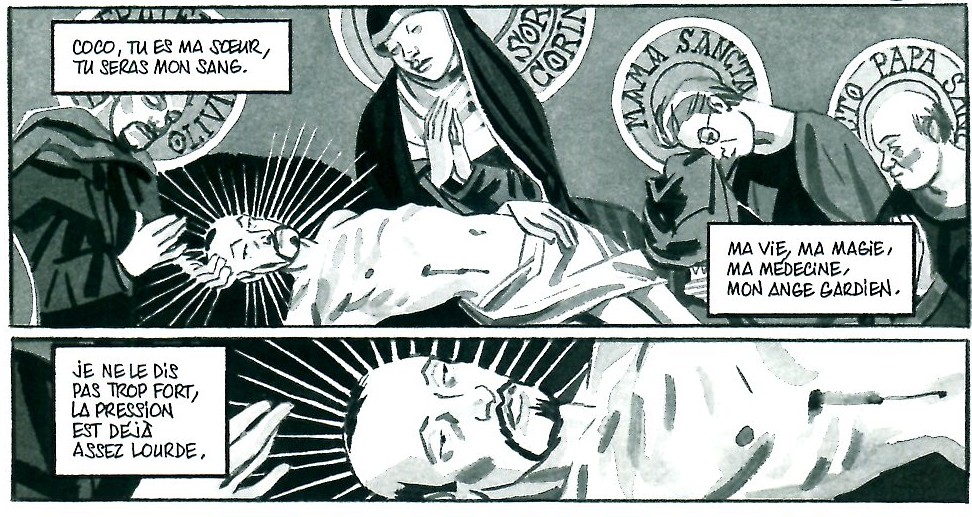 C’est aussi un remerciement à son hématologue qu’il dépeint sous les traits d’une madone en Majesté ; puis, de façon plus réaliste, comme Manara dans Lockdown Heroes ou Miles Hyman dans la série de timbres réalisés au moment du confinement, Chauzy rend un vibrant hommage aux héros du quotidien que sont les infirmiers, les aides-soignants, et les médecins.