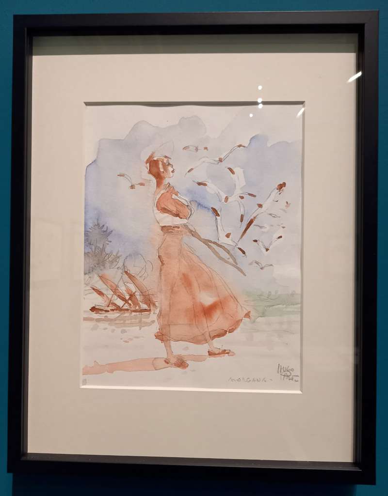 Encadrés par la biographie fictive de Corto Maltese et celle bien réelle d’Hugo Pratt, nous voyageons dans l’univers à la fois réel et imaginaire du célèbre marin et de son créateur grâce à une superbe scénographie sculptant l’espace par le biais de grand panneaux semi opaques jouant avec la transparence et mettant particulièrement en valeur les sublimes aquarelles du maestro. On en prend plein les yeux !