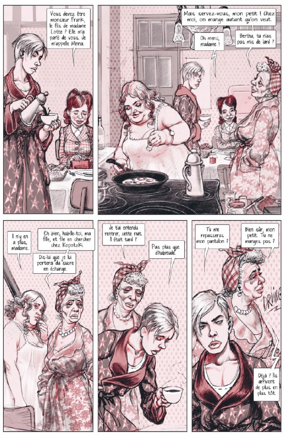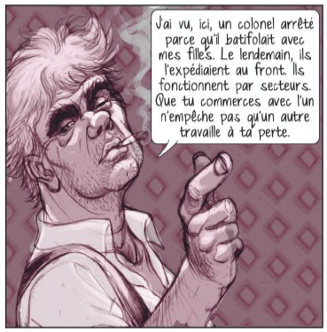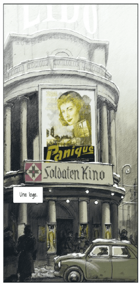 Et ce sont ces deux couleurs en parfaite harmonie qui vont venir rehausser le gris : le vert-gris militaire rappelant l’occupation, et le rose – couleur des petites filles dans notre imaginaire collectif – souillé ici par la perversion.