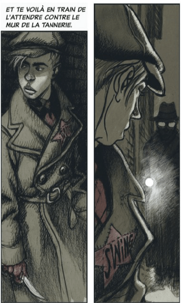 Pour Frank, Yslaire s’est inspiré des zazous qui pendant l’Occupation, défiant les autorités de toutes sortes affichaient une attitude insouciante à l’égard de la guerre et dont un certain nombre par défi, s’affichèrent avec une étoile jaune marquée Zazou, Swing ou Goy … lorsque lors du port obligatoire de l’étoile jaune. Et c’est Swing que l’on retrouvera sur l’étoile rose à cinq branches arborée par Frank sur son manteau, un mix de l’étoile des Zazous et l’étoile rouge des communistes. Tout comme les rues sont parsemées d’affiches soviétiques ou nazies détournées, cette étoile rose retournée occupera le centre d’une croix sur les fanions de l’occupant invoquant l’occupation allemande ou soviétique.