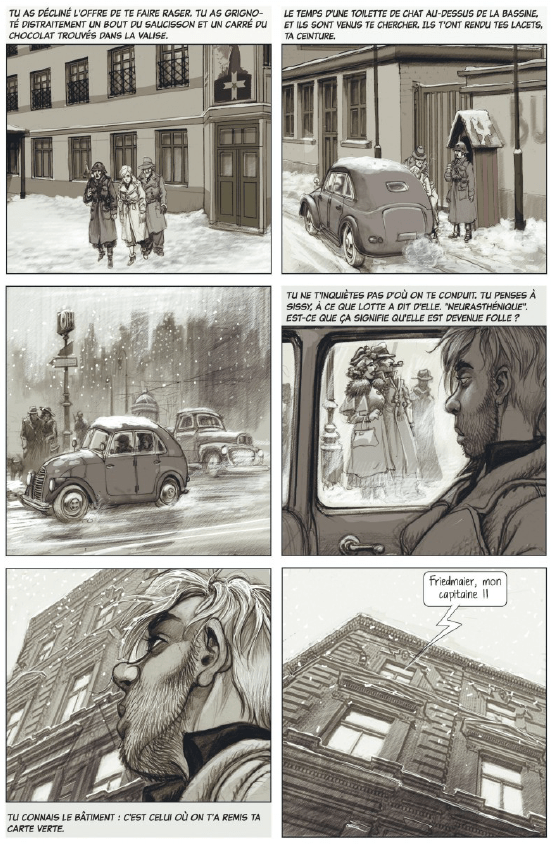 « Il [JL Fromental] adapte le récit en un scénario découpé, dialogué, ne donne qu’un minimum de détails pour décrire les personnages et les situations. Je me fie à la synthèse qu’il a opérée du livre, sans me référer au texte d’origine, même si je l’ai lu. J’ai ainsi toute liberté de mettre en scène le récit, de mettre en images et en cases, de remplir tous les vides que suscitent la cohérence d’une narration graphique et la représentation crédible d’une époque, d’un climat, d’une ambiance indicible. »