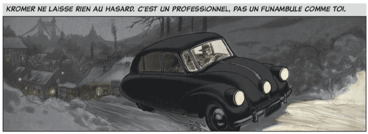 Simenon est un faiseur d’atmosphères, ce que le dessinateur à su parfaitement retranscrire graphiquement. La neige omniprésente n’est jamais blanche et semble recouvrir sous une chape de plomb cette ville où jamais ne perce le moindre rayon de soleil. L’utilisation d’une palette de tons désaturés où prédomine le gris vient renforcer la grisaille et le côté glauque de cette ville qui semble enfermée dans la brume.
