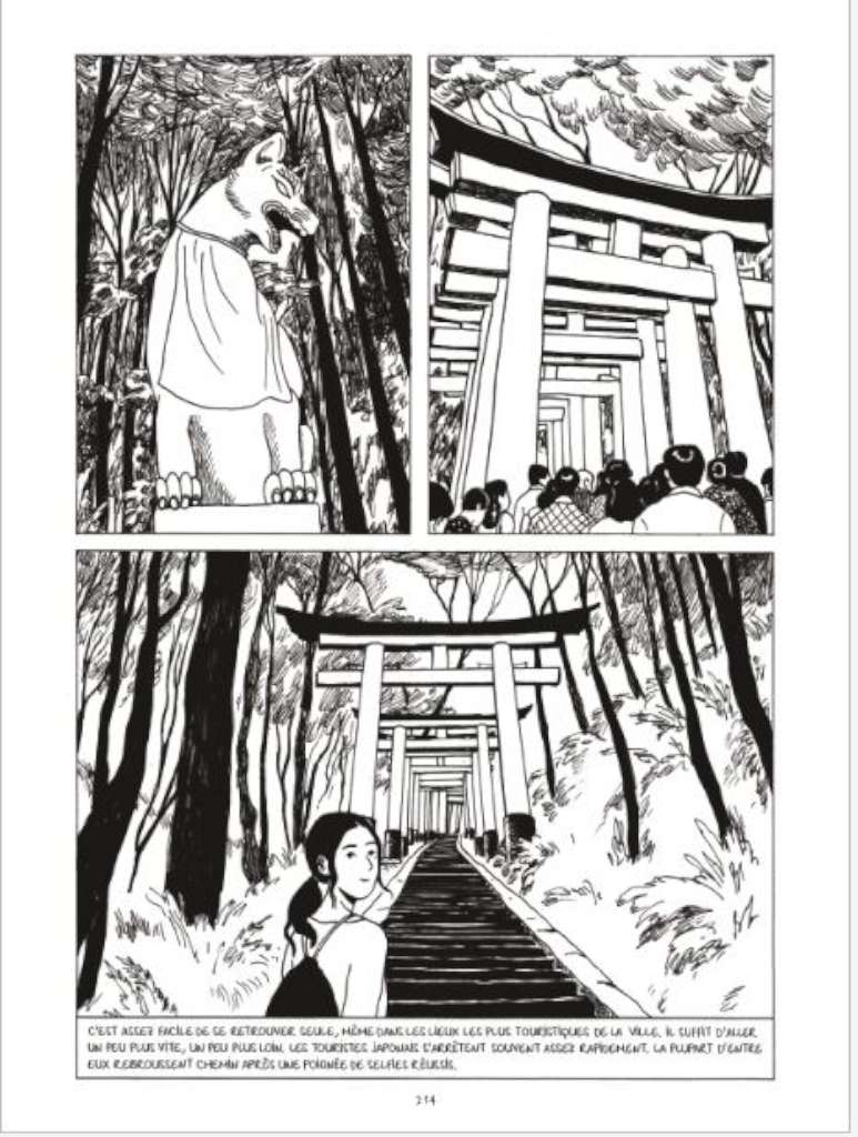 D’emblée, on observe donc un rythme particulier, un véritable éloge de la lenteur, créé par les longues pauses narratives telle l’escapade de 4 jours à Kyoto. L’ensemble devient presque contemplatif. Voyages et déplacements constituent à eux seuls la trame de l’histoire. Rosalie marche et pédale beaucoup dans ce roman : comme dans « L’Homme qui marche » de Jiro Taniguchi. Il n’y a pas de « dramatisation » mais un simple déroulement chronologique et nous arpentons l’archipel en même temps que Rosalie découvre au fil des saisons paysages et coutumes.