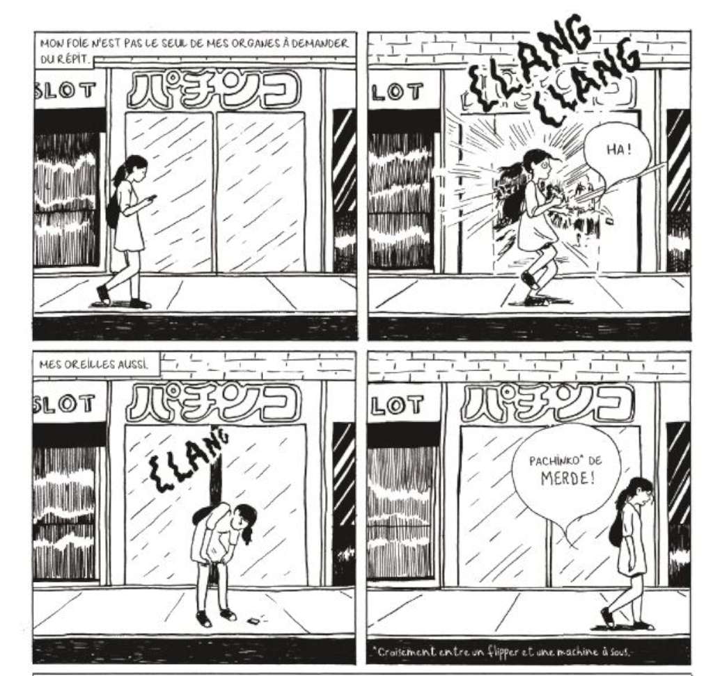 Elle prend son temps pour nous transmettre l’atmosphère, poser un décor et faire du Japon un deuxième personnage à part entière. Elle prête attention aux ambiances sonores – elle vient d’une famille de musiciens – et transcrit des mots et même des onomatopées en japonais.