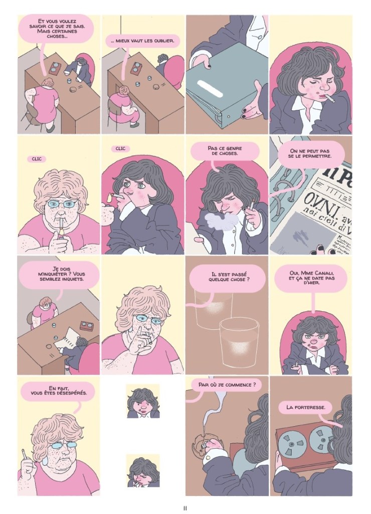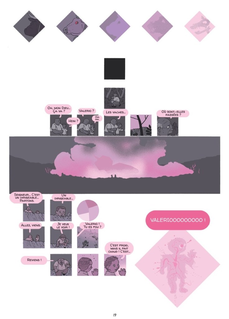 « Je l’ai “empruntée” à la phase stylistique la plus récente de Chris Ware, que l’on peut voir dans le volume de Rusty Brown. Je pense que l’alternance d’espaces blancs et de vignettes reliées entre elles “personnalise” le flux narratif d’une page : la lecture est accompagnée le long d’une ligne temporelle spécifique et, en même temps, elle se ramifie dans les détails et les actions simultanées de cette scène, sans perdre son orientation. L’absence de structure rigide permet également de donner à chaque vignette la bonne dimension : le poids narratif doit changer, il ne doit pas toujours être le même.«