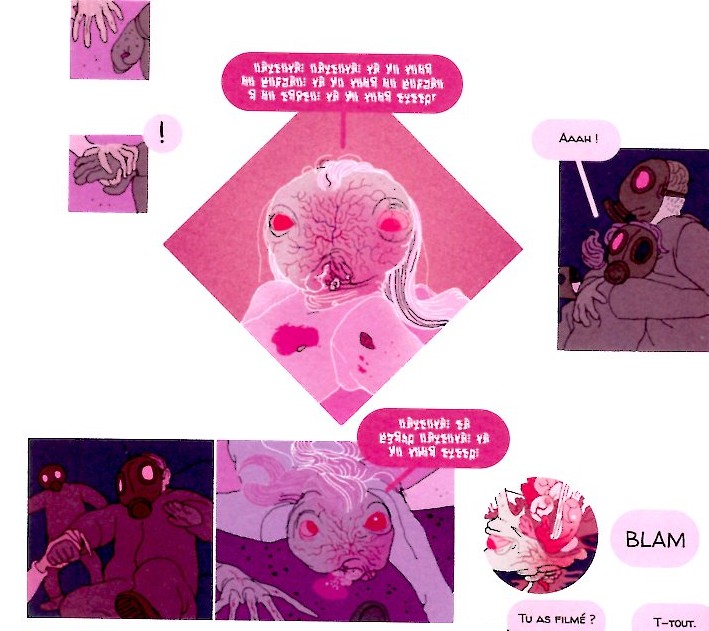 Les couleurs sont désaturées. Ajoutant à l’étrangeté du récit, la couleur du vaisseau, le rose, souvent accompagnée de sa complémentaire le vert domine l’ensemble et ce, jusque dans les bulles.