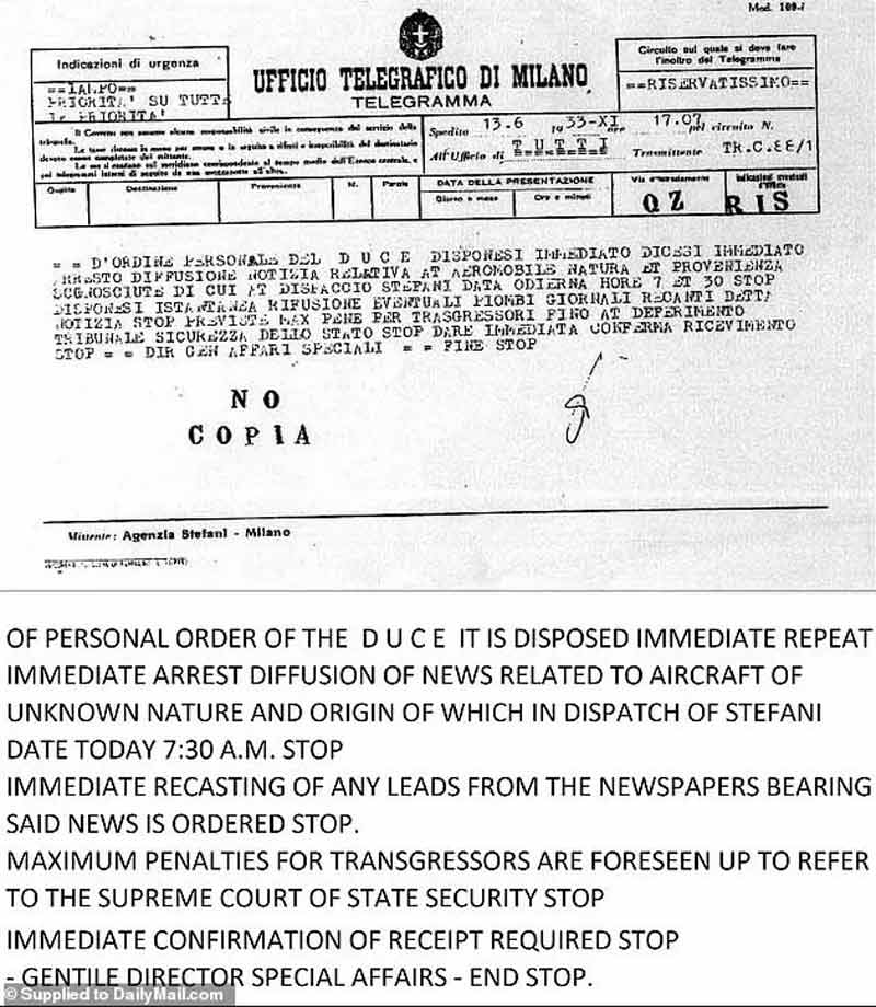 Roberto Pinotti, sociologue, journaliste et écrivain, ufologue fondateur et secrétaire du Centre national des ovnis, dit détenir des preuves concernant le crash d’un OVNI le 13 juin 1933 dans les environs de Milan (Italie) dont deux télégrammes d’époque, dont le but aurait été d’étouffer l’affaire. Il évoque l’existence d’une commission secrète nommée Gabinetto RS/33 mandatée par Benito Mussolini qui aurait été dirigée par Guglielmo Marconi, prix Nobel de physique 1909, l’un des inventeurs de la radio et la télagraphie sans fil. L’engin volant aurait été caché dans un hangar à Vergiate avant que les Américains ne s’en emparent à la fin de la seconde guerre mondiale …