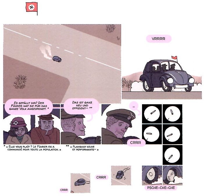 Pour d’autres évènements en revanche, on peut noter un décalage dans le temps une certaine anticipation. Ainsi, Lorenzo Palloni aime-t-il brouiller les pistes et se jouer du lecteur en distillant quelques anachronismes. Bien qu’étant à l’étude dès le début des années 30, les premiers prototypes de la voiture du peuple allemande ont testés en 1938 et le Cynar, le fameux apéritif à l’artichaut n’a vu le jour qu’en 1948.