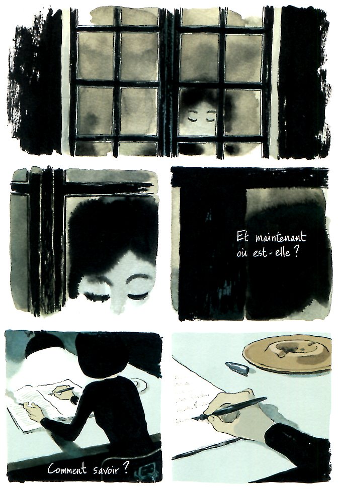 Il y a quelqu’un sans lequel cet album n’existerait pas. Il s’agit de Terkel Risbjerg, bien sûr. Comme dans les précédents albums, son trait tout en simplicité et en sensibilité vient donner vie à cette histoire hors-normes. La mise en couleur alternant et conjuguant le noir profond de l’encre de Chine à des lavis tour à tour sombres ou lumineux est impeccable, retranscrit formidablement bien les différentes ambiances et sublime le charme envoûtant de Rachel. La couverture déjà annonçait la couleur, ou plutôt les couleurs, couleurs éclatantes qui vont d’ailleurs être reprises pour les pages de garde venant souligner l’élégance de l’objet. Quant aux scènes oniriques, elles sont de toute beauté. Mention spéciale au survol nocturne chagallien de Borgen où plane encore l’ombre de Peter Pan …