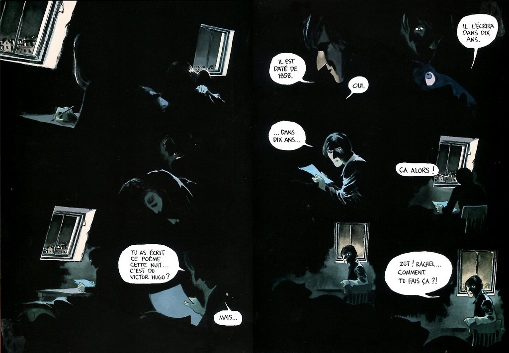 Elle est non seulement capable de voir le passé et le présent, mais également l’avenir. Elle voit le poème que Victor Hugo n’écrira que dix ans plus tard et cela stupéfie Page, son alter ego, son ami et confident, son double qui scrupuleusement trace le fil de la vie de celle qu’il nomme sa muse dans un carnet qui ne le quitte pas.