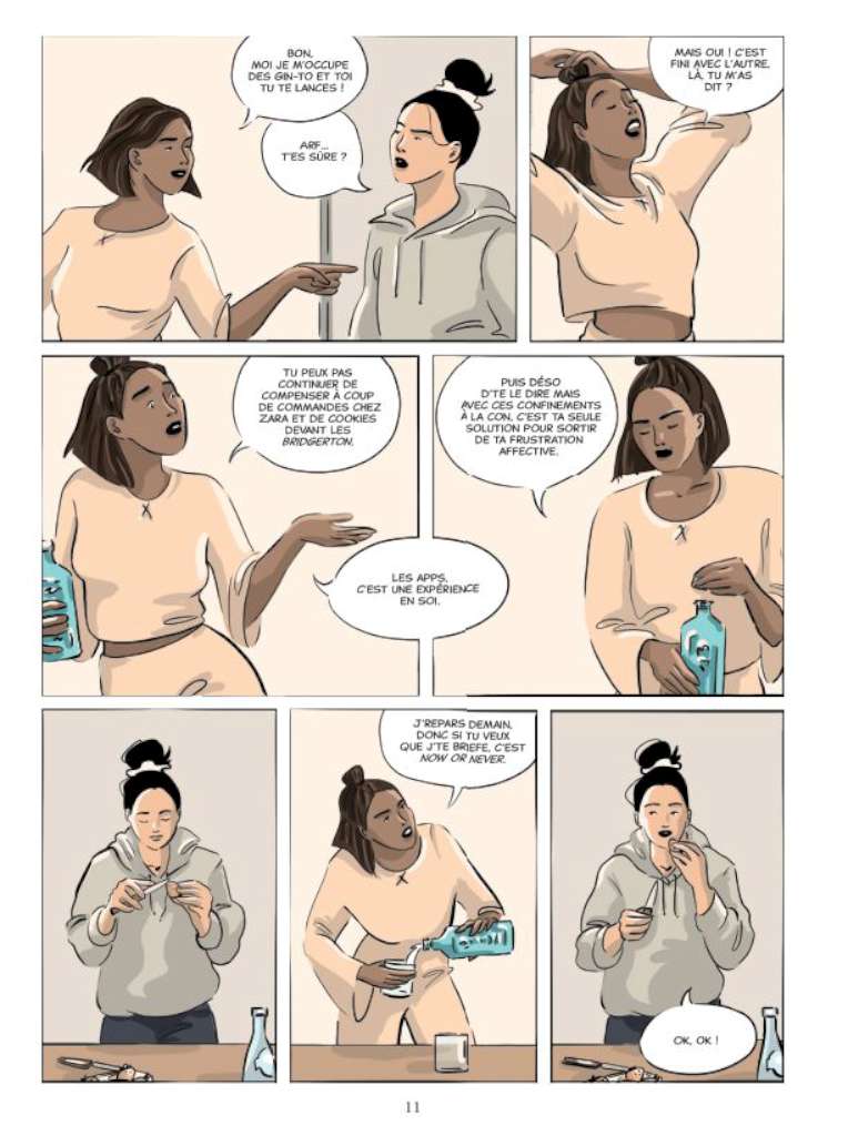 L’autrice dit avoir été très marquée par le monologue intérieur dans « Le Bleu est une couleur chaude » de Jul Maroh ou encore « In Waves » d’AJ Jungo et elle en fait usage ici. C’est Selma qui raconte son histoire, livre ses doutes et ses réflexions dans une voix off au style plutôt châtié qui contraste avec le langage « jeune » des dialogues qui permettent de fournir finalement, à la manière des films d’Arnaud Depleschin pour les années 1990 ou de Cédric Klapisch pour les années 2000, un portrait choral de la génération des années 2020 avec comme sujet principal les relations humaines sur fond de tics de langage, bande son de l’époque et spots incontournables.