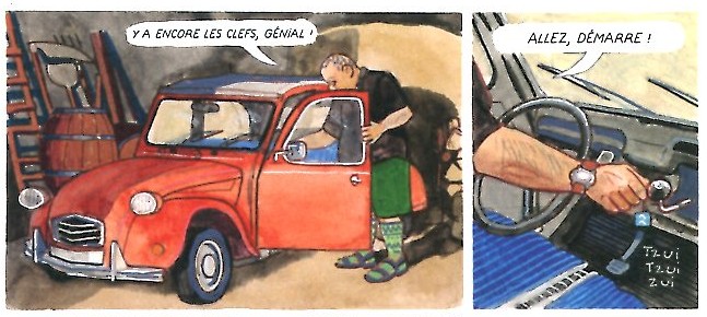 Contrairement à sa fille, Rachel aurait tendance à tout vouloir garder. Elle est celle qui va montrer le plus d’empathie avec le disparu. Elle qui a renoncé à ses aspirations artistiques ne peut qu’être touchée – plus que par les tableaux – par les dessins et peintures qu’elle a retrouvées dans le fameux carton à dessins de la couverture et également par la découverte de la bible de ses 20 ans, l’incontournable Du Spirituel dans l’art et dans la peinture en particulier de Kandinsky. Nostalgie de la vie de bohème de sa jeunesse … qui entre en contradiction avec sa vie rangée auprès de Philippe, bricoleur féru de mécanique à un point tel que c’en est presque obsessionnel. Lui, c’est la 2CV trouvée dans la remise qui va réveiller ses propres souvenirs de jeunesse et lui faire voir en l’homme miroir un voyageur épris de liberté.