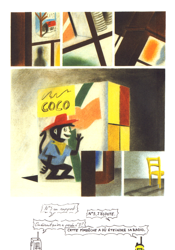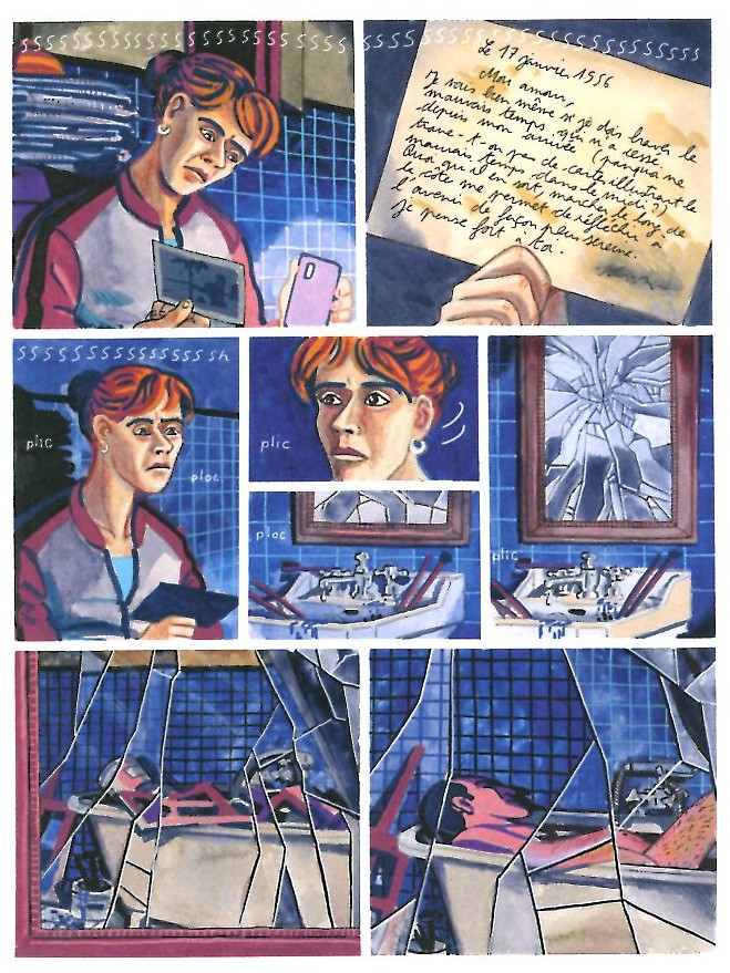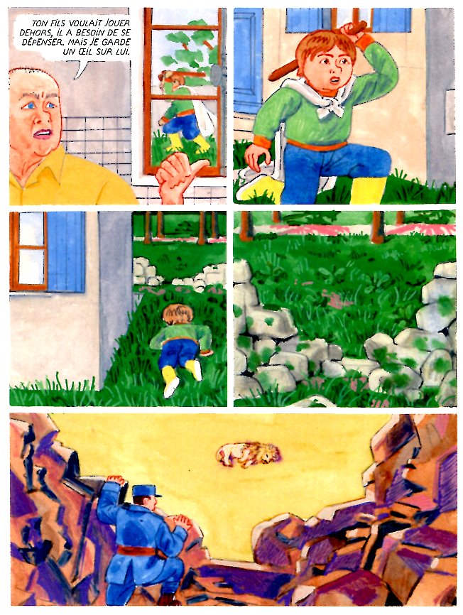 Il a travaillé en tradi. Pas d’encrage ici mais un trait de contour exécuté aux crayons de couleur qui se veut discret et l’utilisation de gouache et d’aquarelle pour la mise en couleur avec de léger changements de palette qui permettent de passer plus aisément d’un univers à l’autre, du réel au fantasmé ou au passé.