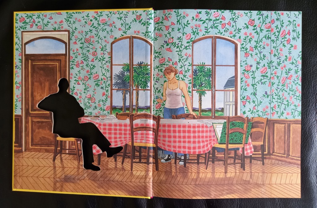 Quand on ouvre l’album, nous retrouvons, telle la pièce manquante d’un puzzle, cette silhouette vide assise en bout de table de la salle à manger; au centre de la pièce, Élise, une carte postale à la main …