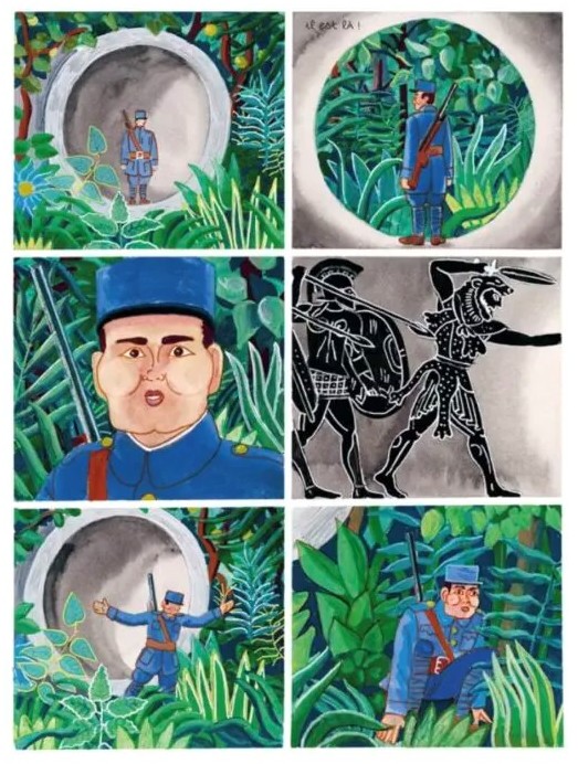 Un petit mot sur les 4 tableaux enfin qui eux aussi sont un mélange des genres. De facture pseudo orientaliste à la manière d’un Delacroix ou d’un Gérôme, chacun est un amalgame de différents styles et époques. Ne voit-on pas sur l’un une bataille entre poilus et soldats grecs de l’Antiquité ? ce qui d’ailleurs marquera le jeune Antoine qui projettera la scène dans un décor digne du Douanier Rousseau.