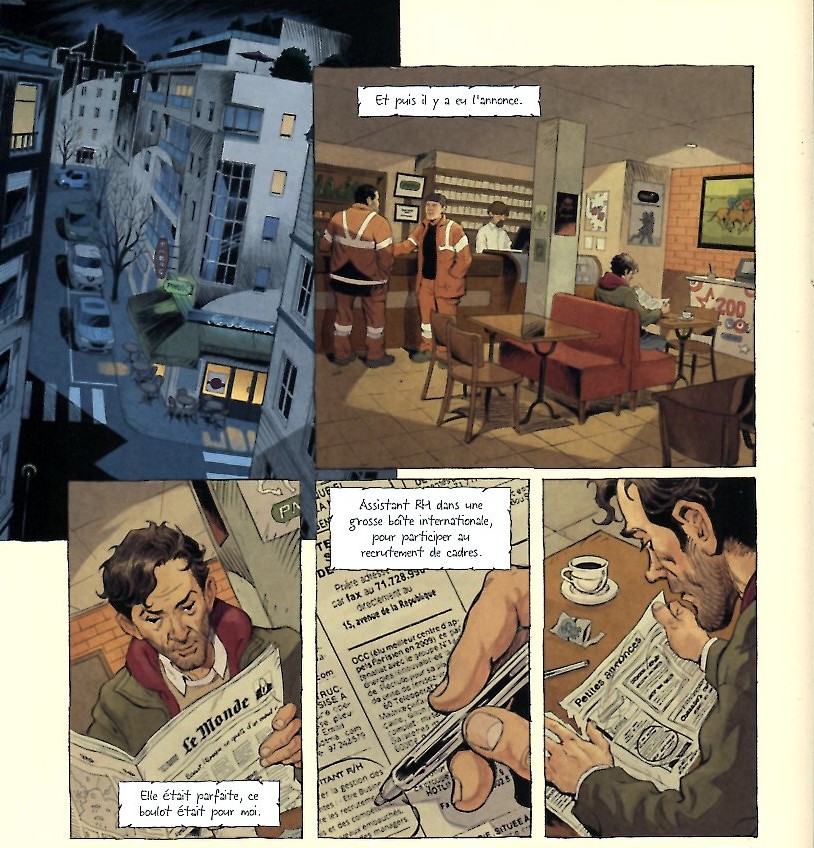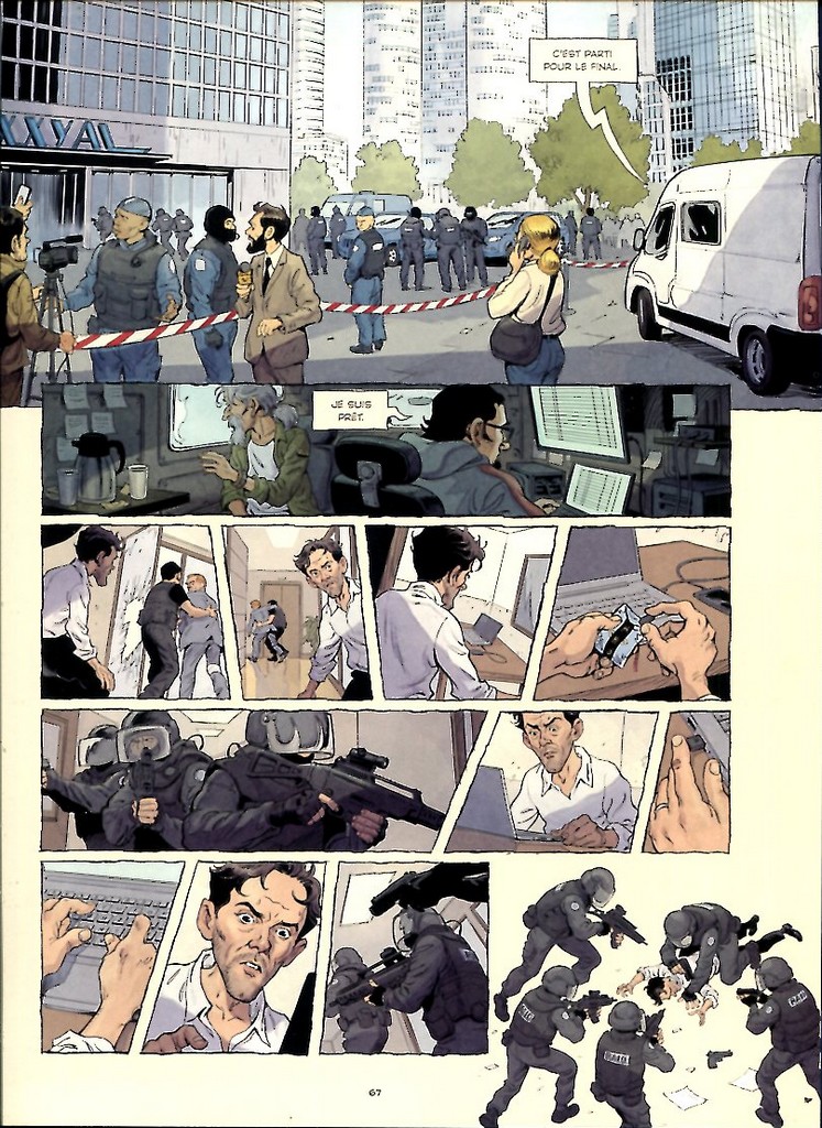 Ce sont les titres mêmes des chapitres et la temporalité qui ont induit les trois tomes. Le découpage est toutefois légèrement différent. Les auteurs ont fait le choix de regrouper dans le second tome « Pendant » la prise d’otages et le procès. Le troisième tome « Après » débute à sa sortie de prison alors que dans le roman le chapitre « Pendant » est entièrement consacré à la prise d’otages. Au cours des péripéties de ce dernier opus, lors de l’affrontement final avec Fontana, vont se mêler plusieurs fils narratifs autour de sa famille mais également de ses anciens compagnons d’infortune des messageries pharmaceutiques Romain – le geek du tome 1 – et le fidèle Charles.