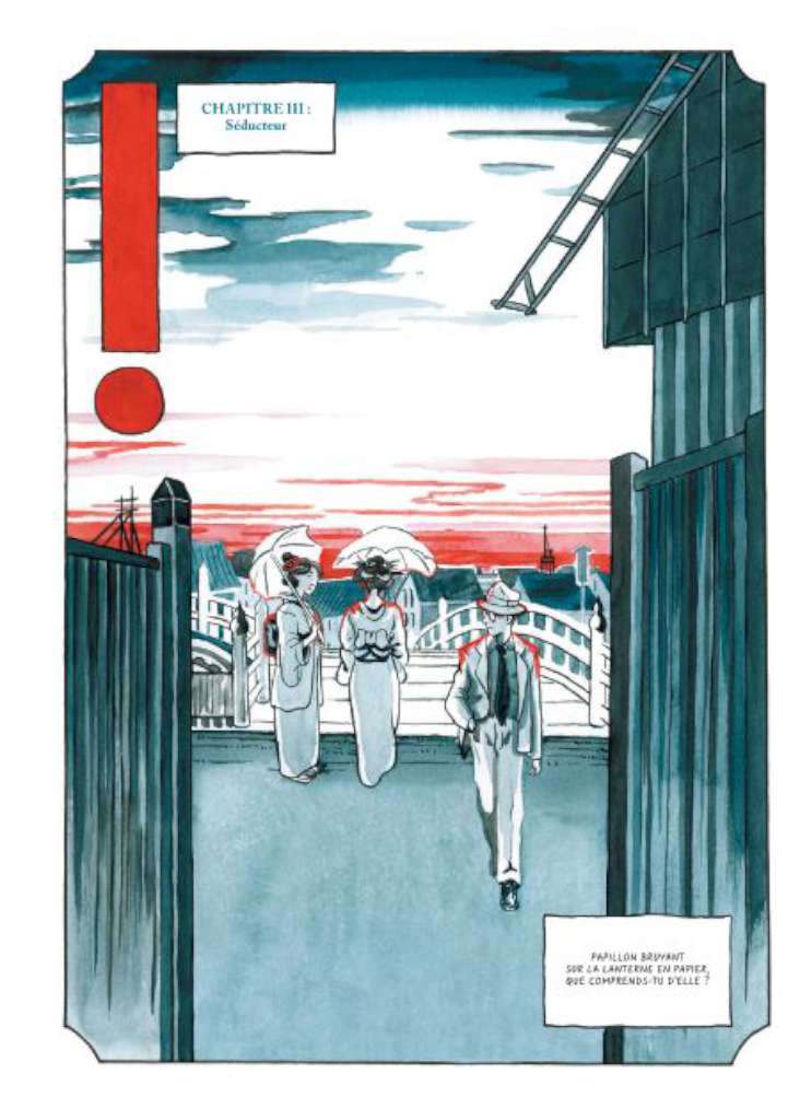 Il reprend aussi souvent les codes du manga pour les expressions de ses personnages qu’il dote globalement de physionomie « ligne claire ». Il inclut également d’autres influences artistiques : le cinéma dans le prologue nous l’avons vu, mais aussi la photographie. Ainsi, dans le chapitre VII, la jeune geisha narratrice vient de faire l’acquisition d’un appareil photo et son récit est uniquement présenté sous forme de « clichés » en noir et blanc.